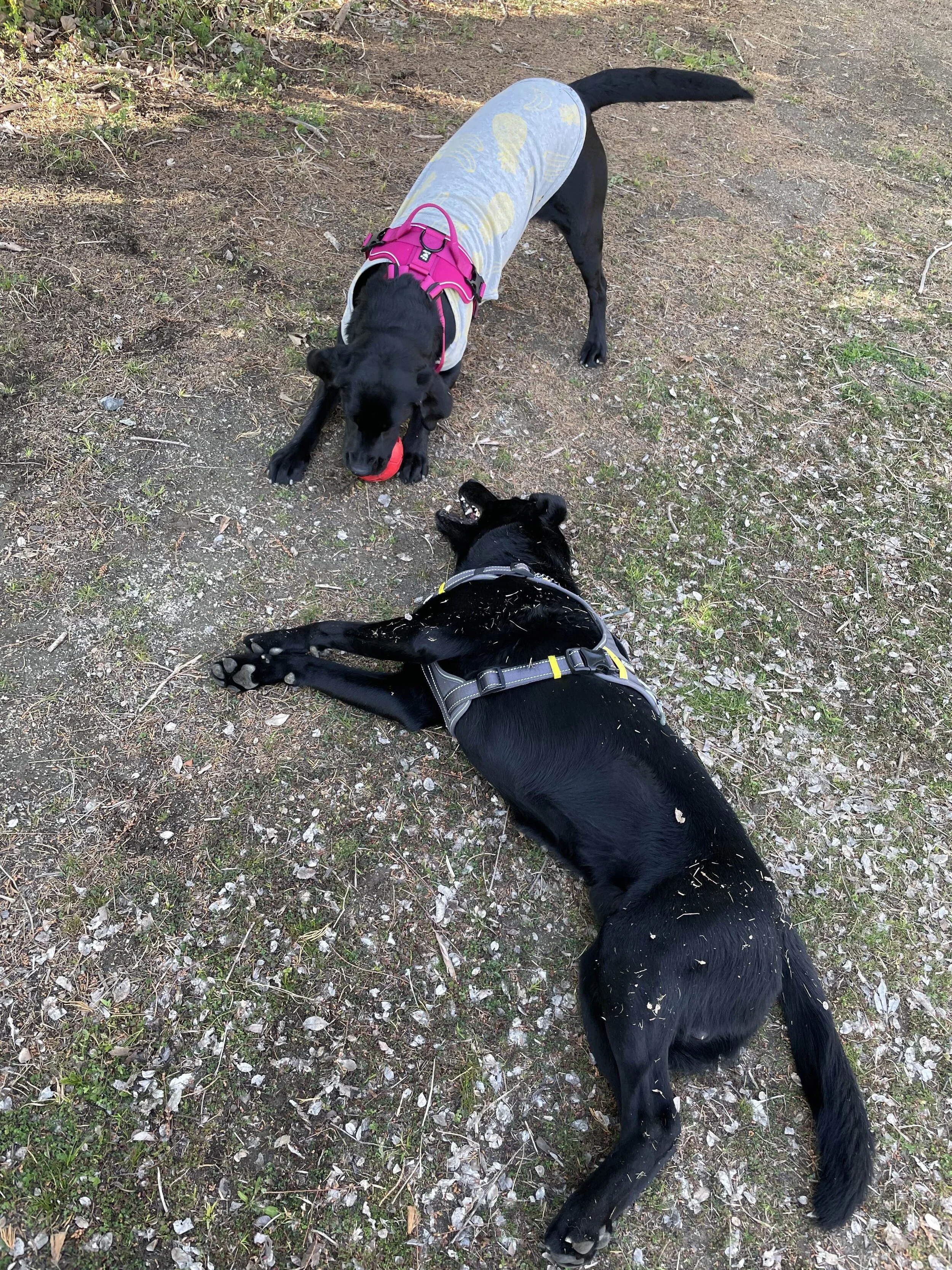 お昼から、3人で一緒に散歩に行ったりもする。ただ一緒に時間を過ごすためだけとも言えるし、もちろん、僕のおしっこタイムでもある!! 時々、友達と会うこともあるけど、それはいいことでもあるし、悪い?ともいえる。いいことは、もちろん、友達と遊ぶのは楽しい! 悪いことは、いつまでも遊び続けて、そのあと、ぐったり疲れ切ってしまうから。僕はもう十分だよ、もう疲れたよってことをママとパパに伝えるために、バタンキューって横になって合図することにしてる。
