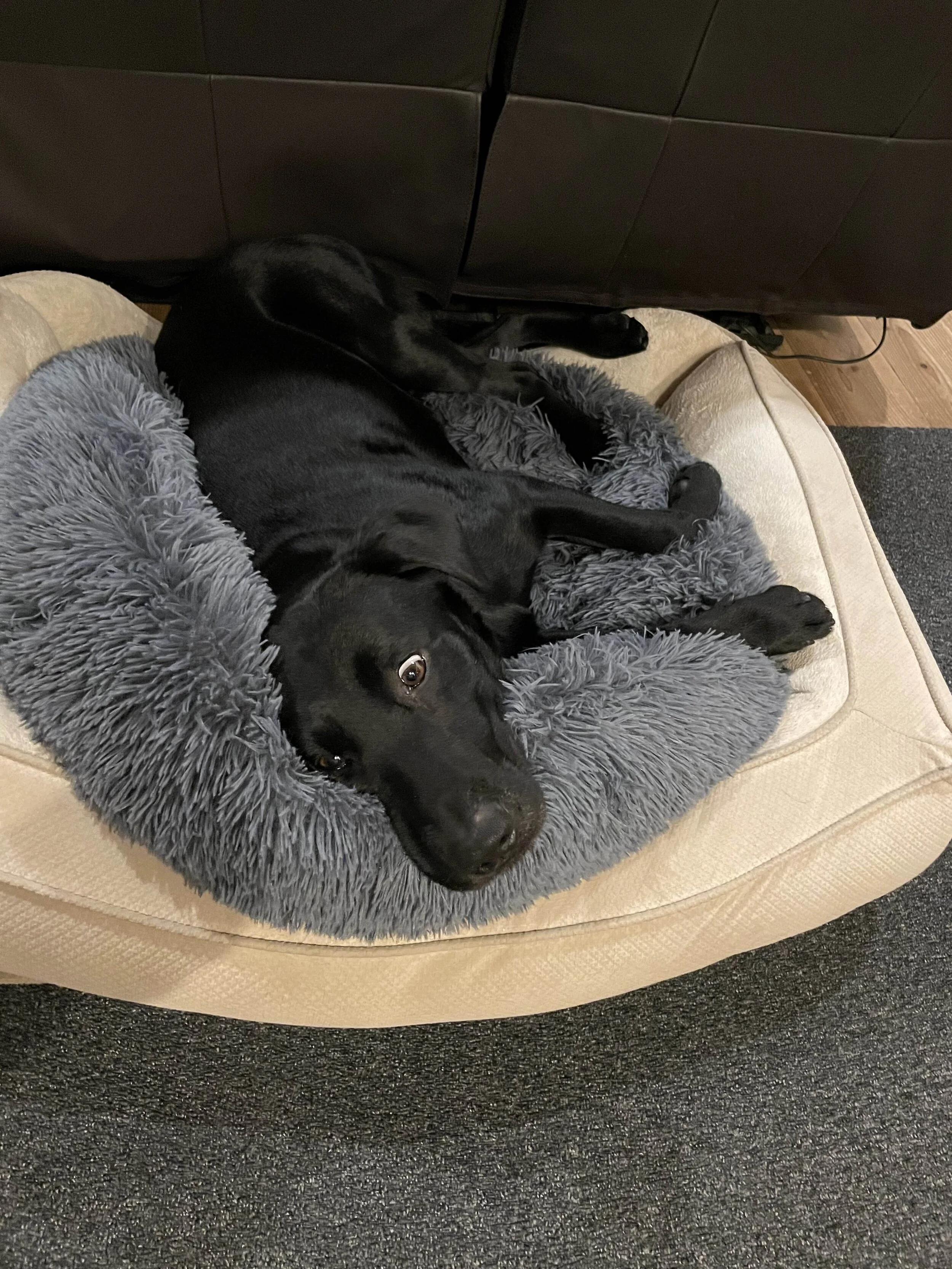 僕の夜のおしっこが終わっても、まだソファでゴロゴロしてるママとパパにヒューンヒューンって言ってどいてもらう。だってソファは、夜の間は僕のベッド、僕が占領できるところなんだから。やっとママとパパがどいてくれた。僕は一番気持ちよくてまだ少しママとパパの体温が残ってる暖かいところで体をぐーんと伸ばして眠る。